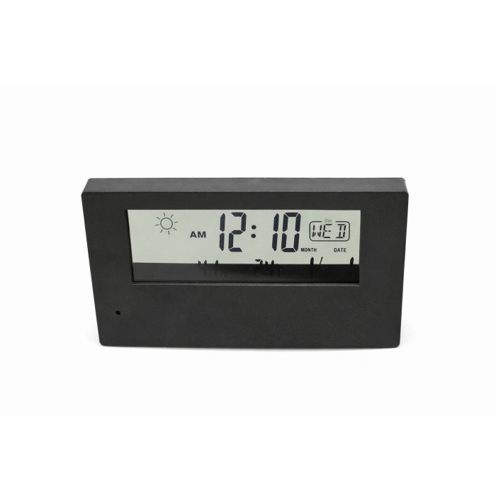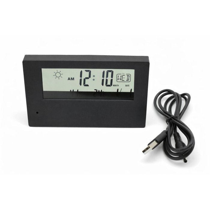 Slēptā kamera ir paslēpta ciparu meteostacijā. Darbības princips ir līdzīgs tīmekļa kameras principam. Jūs varat skatīties vēlamo attēlu no jebkura attāluma. Ar šo kameru var ne tikai slepus uzraudzīt attēlu, bet arī ierakstīt atmiņas kartē. Ierīces darba laiks ar slēpto IP tīmekļa kameru ļaus jums redzēt attēlu caur viedtālruni no jebkuras vietas pasaulē. Šai IP kamerai ir iespēja visu laiku ierakstīt attēlu vai arī lietotnē nospiežot ierakstīšanas pogu, un ierakstus var skatīt attālināti caur tālruni. Meteostacija parāda laiku, datumu, laikapstākļus ārā un prognozi nākamajai dienai. Mini kamera ir savienota ar Wi-Fi savienojumu ar modemu un saņem informāciju par laikapstākļiem, izmantojot internetu. Ierīce var darboties no akumulatora un līdzstrāvas barošanas avota.